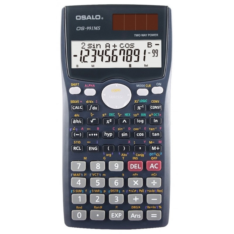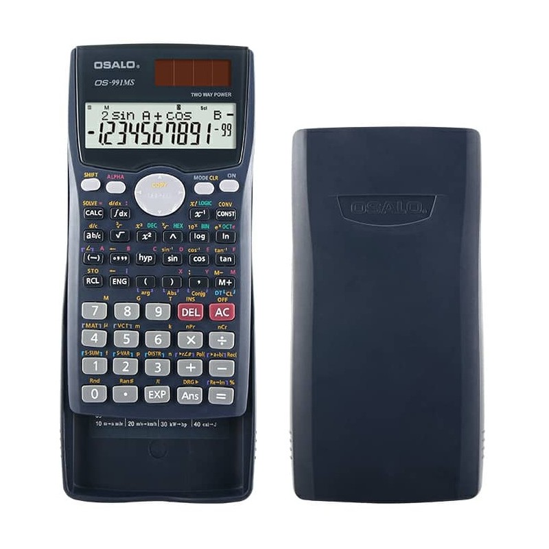 Calculatrice scientifique OSALO OS-991MS – 12 chiffres – 2 sources d’alimentation :Pile bouton (LR44 incluse) + Alimentation solaire – Ecran LCD – Affichage V.P.A.M naturel – Matériel: Plastique – 401 fonctions – Dimensions : 156 x 81 x 17 mm – Poids: 132 g – Couleur Noir