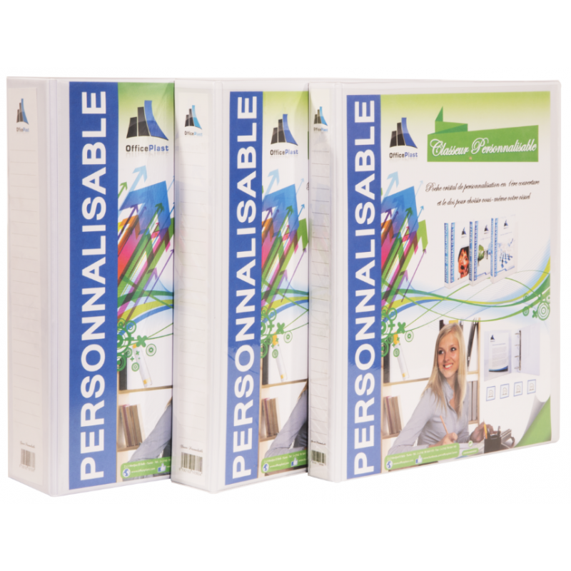 Classeur en PVC Personnalisable D50 – Dos : 75 mm – Format : 24 x 32 cm – Mécanisme semi-automatique 4 anneaux en D – Poche cristal de personnalisation sur 1ère de couverture et dos – Poches intérieures transparentes en 2ème de couverture – Couleur Blanc